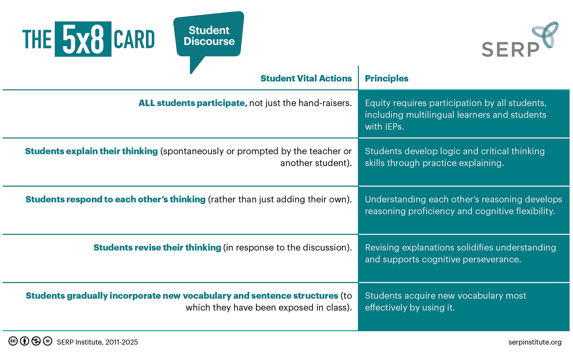 The Discourse 5x8 Card is a resource that is designed to be literally 5” by 8”. It provides a set of “look fors” that allow coaches or administrators to identify features of high quality discourse that students have and have not mastered, providing a focus for feedback and collaborative conversations with teachers.