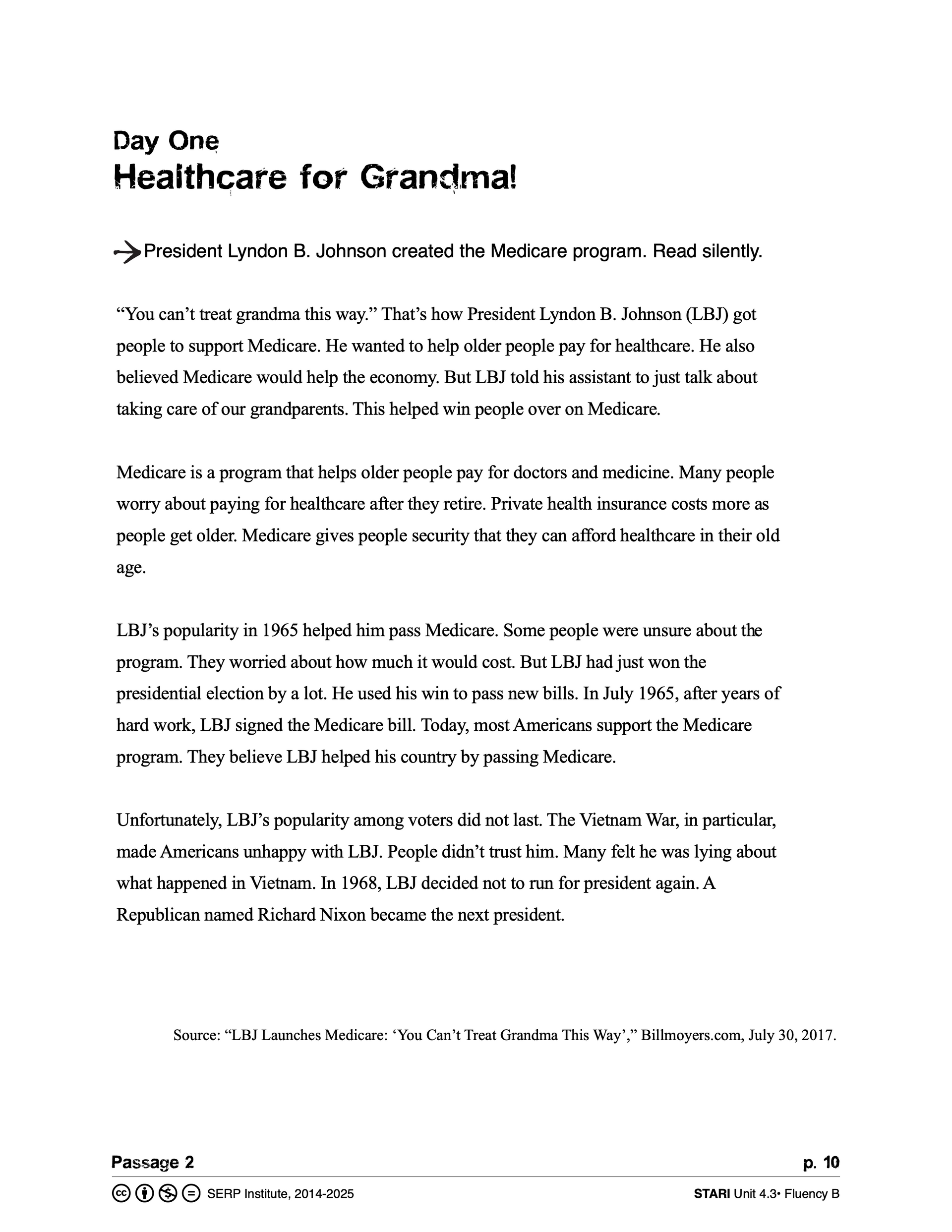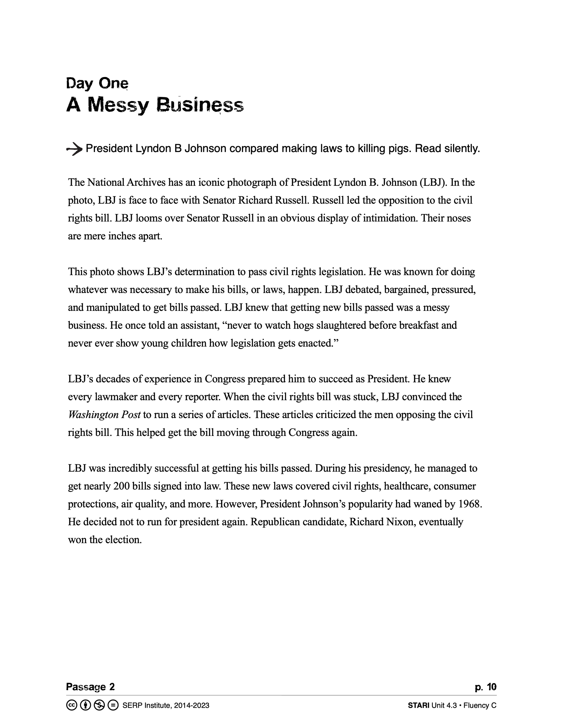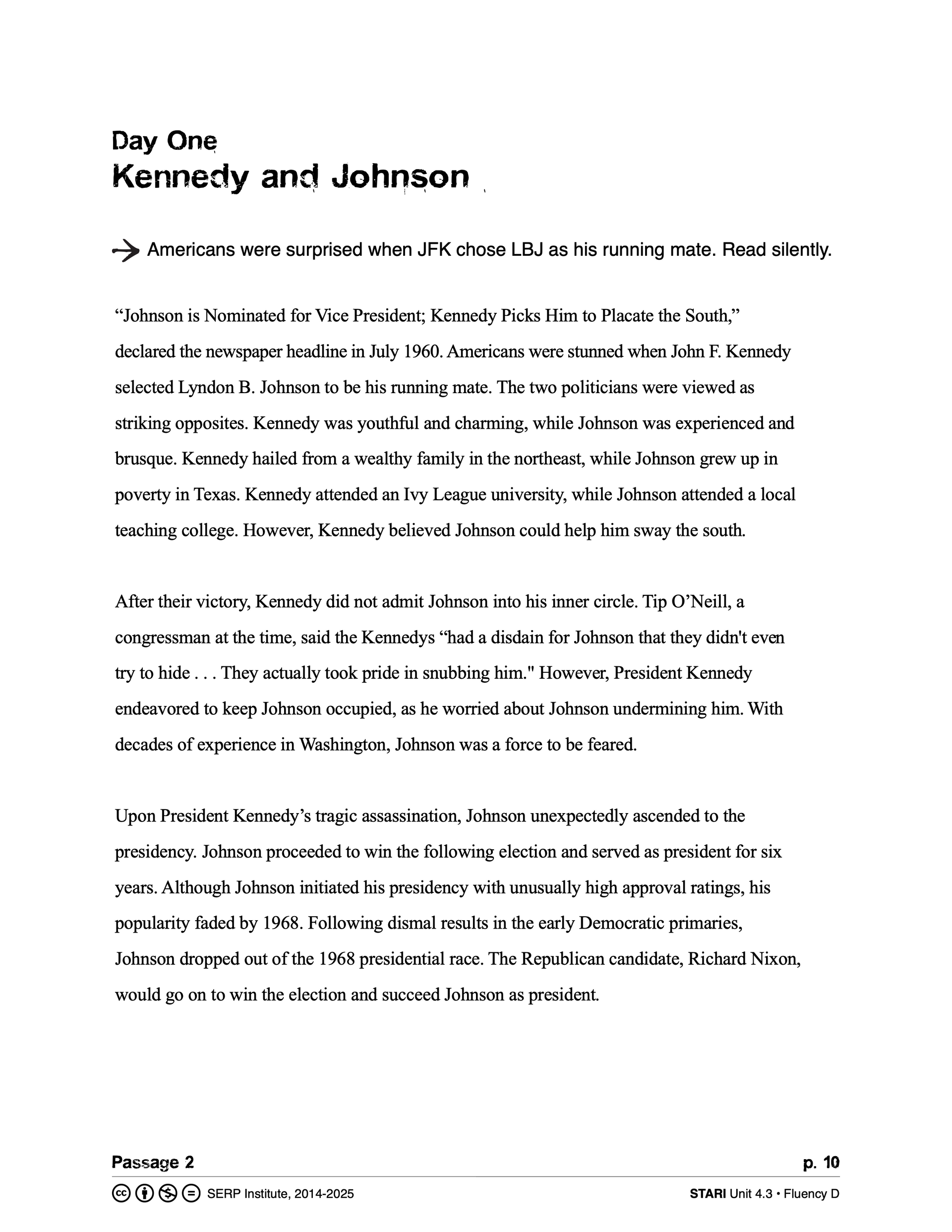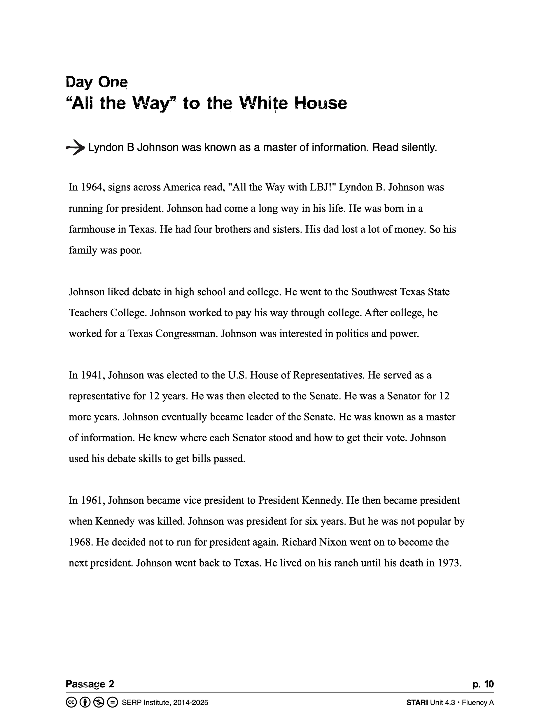 Take Fluency Passage 2 from Unit 4.3. All four passages explore Lyndon Baines Johnson, America's 36th president, but each offers a different lens:
